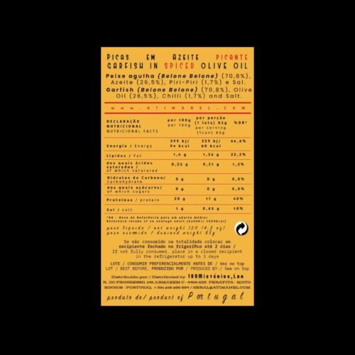 Ingredients: Garfish (Belone belone) (70.8%). Olive Oil (26.5%). Chilli (1.7%). and Salt.